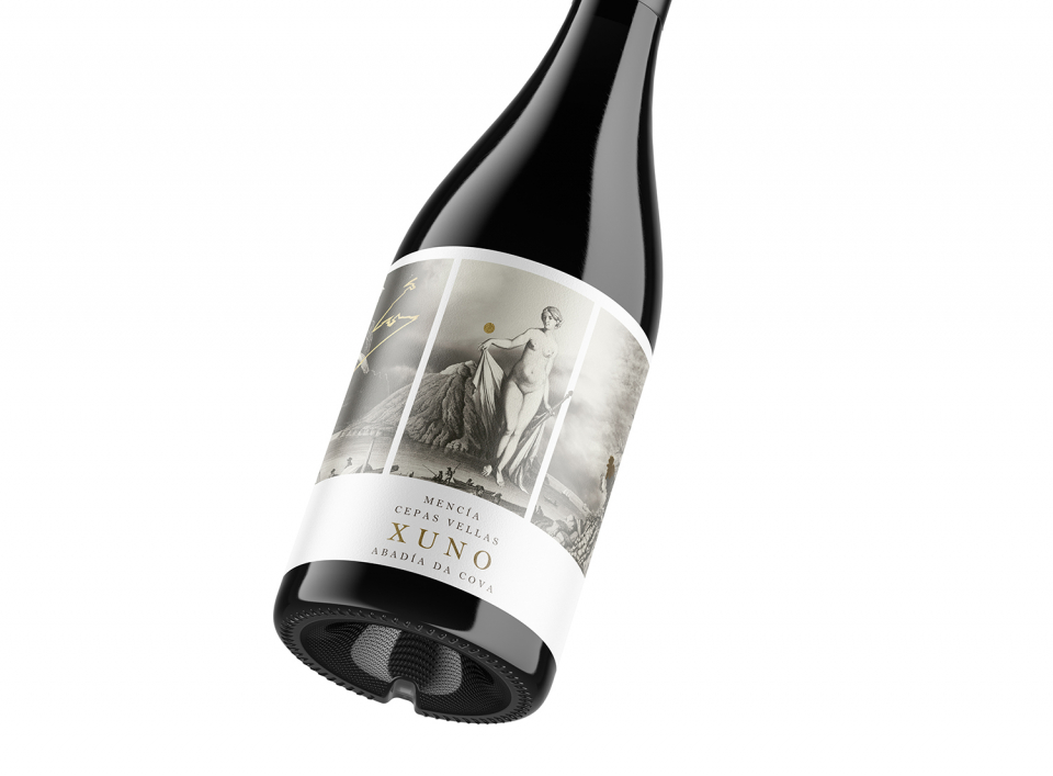 Esta etiqueta de vino para Abadía da Cova ha evolucionado en el tiempo en su diseño pero no en su forma principal , siendo la ilustración de Xuno el elemento principal y carcaterístico de este vino, y lo que lo diferencia de otros vinos de la Ribeira Sacra.